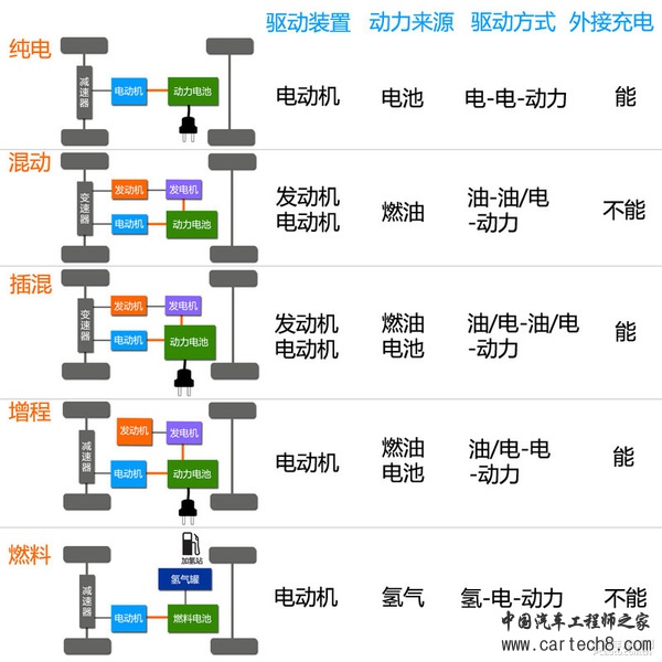 最后,通过以下简单的图表即可看清各种混合动力、纯电动汽车以及燃料电池汽车间的主要区别,以及不同车型的补贴金额:
