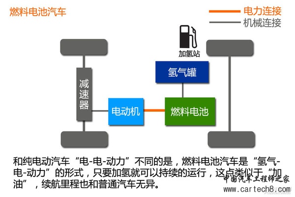 燃料电池汽车实际上是通过氢气和氧气的化学作用,产生的电能驱动车辆行驶。它也是电动汽车的一种,结构基本类似,只不过多了一个燃料电池和氢气罐。
