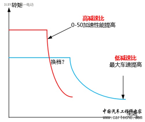 上图表达了一个意思,在没有变速器的情况下,最高车速、加速性能与百公里电耗三者之间是此消彼长的关系,不可能同时达到3者最优。图中上面那个箭头,体现出在没有变速器辅助下的电机的尴尬:要么采用小减速比,尽量提高最高车速性能;要么采用大减速比,尽量满足0-50km/h的低速加速性能。具体来说如下面的示意图所示,如果采用了小减速比,那么最大车速会提高(蓝色线);如果采用了高减速比,那么最大车速会变小,但在0-50km/h的最大输出转矩增加,加速性能会提高。这就是所谓的性能指标的trade-off关系:你好我不好,你不好我才能好,这是一对冤家的矛盾。