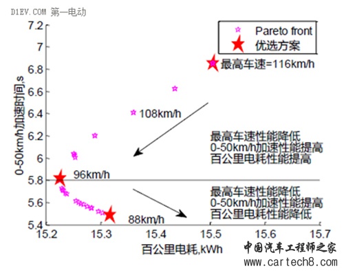 细心的朋友已经发现,两种方案下加速性能、百公里电耗几乎相同,但最高车速大为提高。实际上,在有变速器的情况下,可以优化出其他配置,牺牲最高车速性能,来提高加速性能与经济性指标。