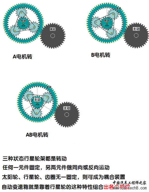 首先要明白电动车多电机多档位自动变速系统的原理和构成。有一种模式可以是:在太阳轮连接一台A电机,将外圈齿轮活动起来连接另一台B电机,①当只有A电机转动,B电机剎车不动、内外齿轮圈保持不动,在太阳轮驱动下,卫星轮在内外齿轮圈內旋转将动力传输至输出轴。②另若B电机转动,A电机剎车不动,B电机轴齿轮带动内外齿轮圈旋转,带动卫星轮围绕着停转的太阳轮外旋转,将动力传输至输出轴。③A B电机同时转动太阳轮和内外齿轮圈的旋转带动卫星轮旋转,将动力传输至输出轴。在这三种状态下,毎种状态有固定的传动比,故选择电机的过程就是换档位。既然三种状态下都能运转,它们相互转换过程互不受牵制,而且转换过程由电器控制器控制,因而不需要离合器就能顺利地换档,这构造简单体积小、重量轻,承载能力强,使用寿命长、运转平稳,噪声低、输出扭矩大,效率高、性能安全而且技术含量并不高。但作用与效果非常理想,它的出现,会给电动车的架构带来颠覆性的革命。