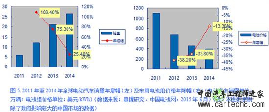 从图5可以看到,车载电池组价格每下降10%,电动汽车销量增长大约在20%~30%之间。不过,随着这几年车载电池组价格的大幅度下降(由2011年的1100美元/kWh下降到2014年的390美元/kWh),现有技术水平下再继续下降的空间不大,价格的驱动力正在用尽,预计本年度车载电池组价格的降幅会到10%以下,而海外电动汽车的市场销量增幅则会降到20%以下。中国电动汽车市场2014年和本年度非常火爆,预计本年度销量将突破20万辆,从而超越美国成为全球最大市场,但这主要是政府强力刺激和市场封闭发展双重措施下的结果,与电池价格的变化的对应关系还不太明显。