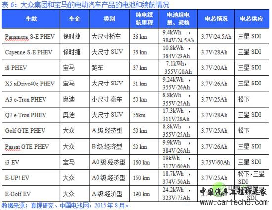 表6:大众集团和宝马的电动汽车产品的电池和续航情况