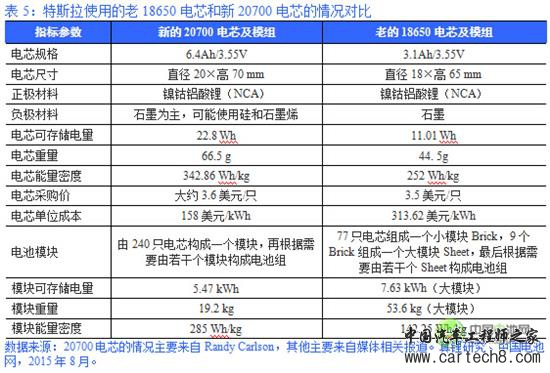 表5:特斯拉使用的老18650电芯和新20700电芯的情况对比