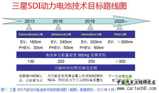 图7. 三星SDI汽车动力电池技术目标路线图(制图:真锂研究,2015年8月)
