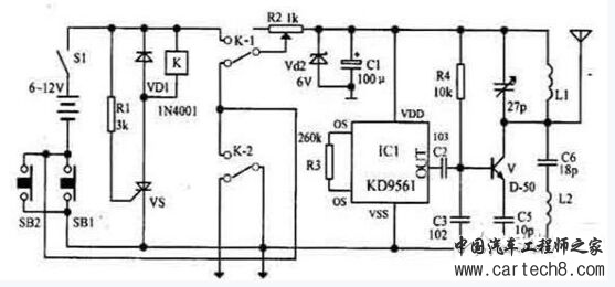 在等待状态时,开关S1接通,而SB1断开(即车头锁被锁住),K就处在释放状态,报警发射机不工作。当车头锁被打开时(即SB1接通),VS 被触发导通,K吸合,接通发射机电源。SB1接通后,K-2的常开点将其自锁,此时只有断开S1报警方能结束。在K动作时,其常闭触点K-l断开,切断发动机点火电路。
