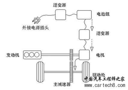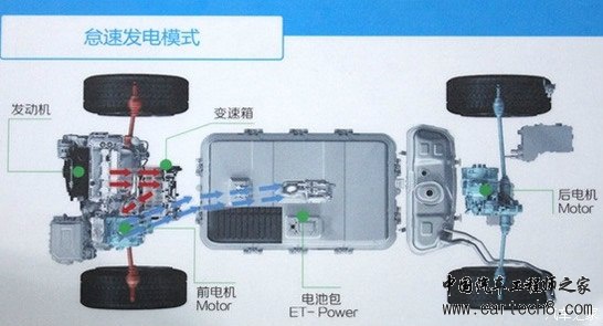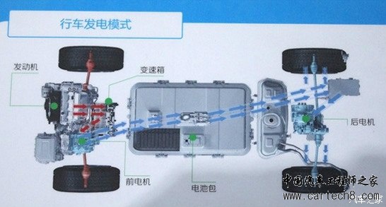 充电模式:当电池电量耗尽式,此时行驶时由发动机给动力电池充电,同时带动变速箱,驱动汽车行驶。这种状态是这这套系统最耗油的状态。