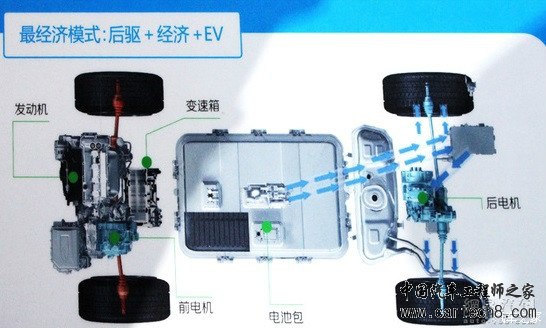 唐的控制逻辑其实也不复杂,四种模式在驾驶过程中由行车电脑进行智能切换。但是我们发现唐在满电(18.4kW·h)、满油(53L油箱)的状态下的实际续航里程只有500km左右(多家媒体实测,官方数据为700km,为啥差别这么大,在电动车的文章里我有详细解说过,感兴趣的读者可以去查阅)。这与常规燃油车相比并不具备多少优势。究其原因还是在于唐在搭载了这一套混动系统后,整备质量达到了2220kg,那套容量达18.4kW·h的磷酸铁锂电池组就重达200多千克。同时这套系统是偏向于性能,电机输出功率过大,导致整车的电量消耗过快。当动力电池的电被消耗完之后,发动机一边要驱动前桥,一边也要带动前桥电机给蓄电池充电来驱动后桥,这个过程燃油消耗比较高。