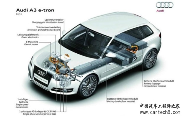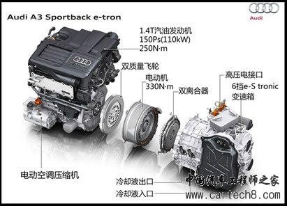 大众在15年先后推出了奥迪A3 e-Tron和Golf GTE两款混合动力车型。这两款车除了锂电池的容量和总功率稍有差别之外,搭载的动力以及控制逻辑基本相同。都是由大众的EA211 1.4TSI发动机,加一台电机(发电机与电动机一体集成)和一组锂电池组成,匹配的是一款名为e-S tronic的变速器。e-S tronic实际就是在目前大众第三代6速DSG变速箱的基础上又加了一个离合器,这个离合器是用来分离电动机和发动机的。 接下来我就以 A3 e-tron的动力结构图来解说大众这套混动系统。