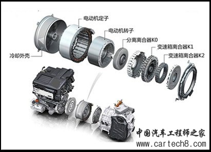 对照上面的两张图,我们会发现大众这套混动的动力系统要比丰田的THS简单的多。这套系统简单来说是由三套离合器来实现了各种模式的切换。电动机是集成在6速DSG双离合变速器的特制铝合金壳体内,与DSG之间通过两个离合器K1和K2连接,而发动机与变速箱之间还有一套分离离合器K0。其主要作用是分离电动机和发动机的连接。当以纯电行驶的时候,发动机并不工作,这时如果发动机和电动机通过传动机构相连的话,电动机会带动发动机曲轴转动,从而浪费电量,所以在发动机不工作的时候,分离离合器K0会将两者断开连接,让电动机独自驱动车辆,达到最大化利用电能行驶的目的。