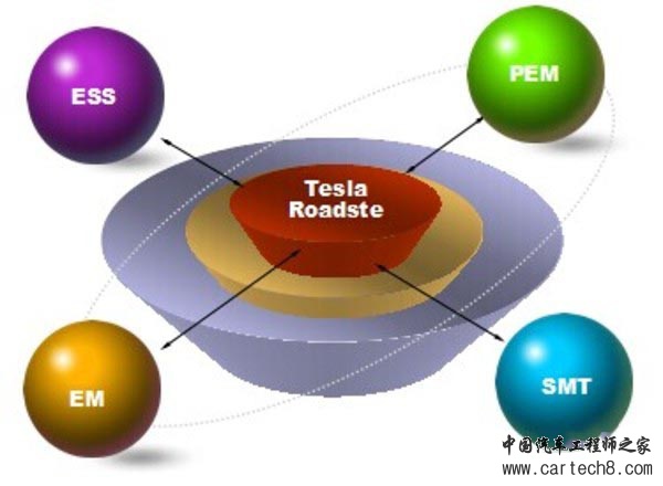 不同于传统的汽油动力车,特斯拉汽车的动力系统主要由四个部分组成:储能系统(EnergyStorageSystem-ESS)、功率电子模块(PowerElectronicsModule-PEM)、电动机(ElectricMotor-EM)、顺序手动变速箱(SequentialManualTransmission-SMT)。