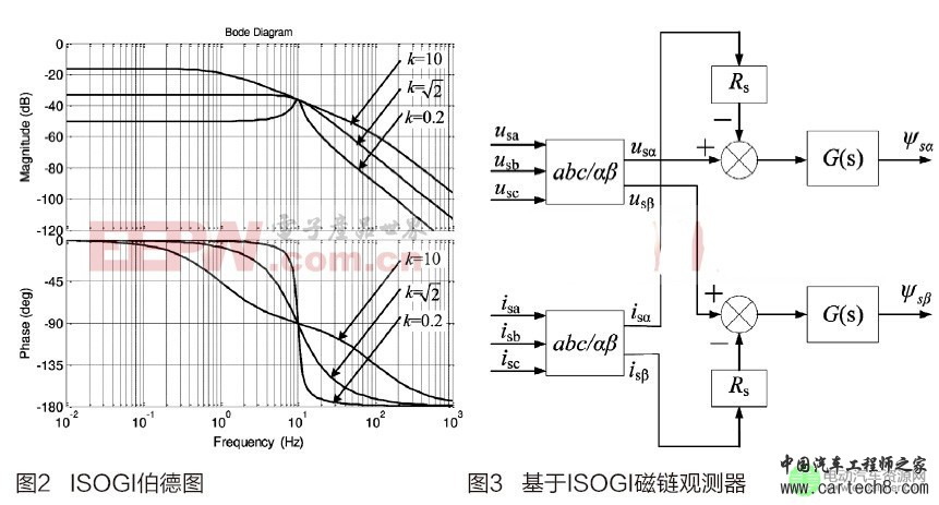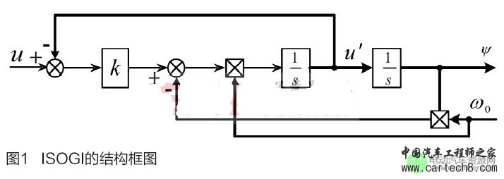 二阶广义积分器(second-order generalized integrator, SOGI)常应用在谐振控制器及正负序分离等场合中对交流信号进行处理,本文对SOGI进行改进可以实现磁链观测功能,从而可以得到基于ISOGI的磁链观测器。ISOGI的传递函数为