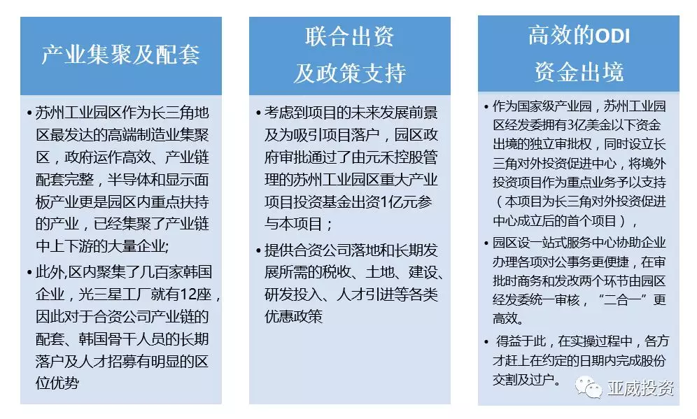 亚威产业投资团队作为联合出资人,疌泉亚威沣盈产业基金的基金管理人,是本次亚威LIS跨境并购合作项目的主要操盘者和推动者,由原亚威股份负责战略投资的副总经理、管理咨询公司合伙人、财务/法务/投资的专家团队组成,统筹推进了项目初期接洽、尽职调查、协议签署、政府及投资人对接、ODI出境、股权交割、项目主体设立等全过程事宜。通过全局操盘本案已经全面熟悉了中韩面板相关产业及韩国资本市场的情况,有能力也有意愿后续聚焦在面板和泛半导体产业投资领域继续深耕。