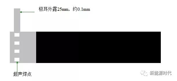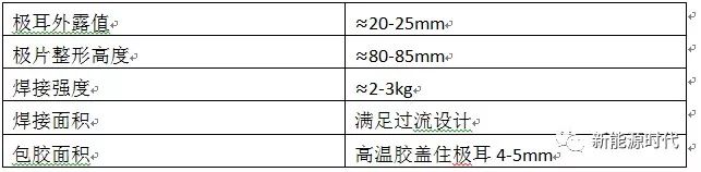 以**650型设计为例,设计极耳外露主要考虑到正极耳要焊接盖帽和滚槽时合理配合。极耳外露过长,滚槽时易使极耳与钢壳短路;过短极耳无法焊接盖帽。极目前超声焊头有线状和点状,国内工艺较多采用线状(过流、焊强考虑)。另采用高温胶将极耳包覆,主要考虑到金属毛刺和金属碎屑造成短路风险。此车间环境温度≤23℃,露点≤-30℃,正极水份含量≤500-1000ppm。