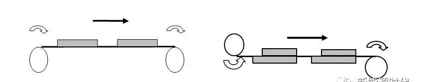 1、正极涂布即将正极浆料挤压涂或喷涂在铝集流体AB面上,单面密度≈20~40 mg/cm2(NCM功率型),涂布烤箱温度常规4-8节(或更多),每节烘烤温度95℃~120℃按实际需要调整,避免烘烤开裂出现横向裂纹和滴溶剂现象。转移涂布辊速比1.1-1.2,间隙位打薄20-30um(避免拖尾导致在极耳位压实过大,电池循环过程析锂),涂布水份≤2000-3000ppm(具体要根据材料和工艺定)。车间正极温度≤30℃,湿度≤25%。示意图如下