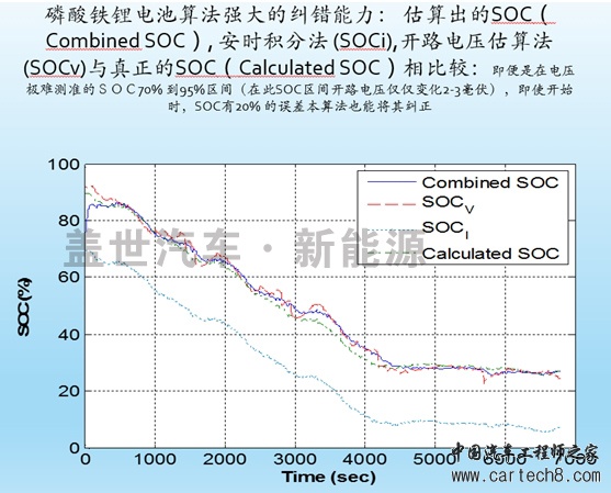 目前世界上BMS做得最好的应该有什么特点呢?它可以在线实时估算电池组的电池参数从而精确估算出电池组的SOC、SOP、SOH,并且能够在短时间内纠正初始SOC超过10%的误差以及超过20%的安时容量的误差或者百分之几的电流测量误差。美国通用汽车公司在6年前研发沃蓝达时就做过一个实验来测试算法的鲁棒性:将3串并联在一起的电池组拿掉一串,这时内阻增加1/3、安时容量减小1/3。但是BMS并不知道。结果是SOC、SOP 在不到1分钟就全部纠正SOH随后也被精确地估算出来。这不仅说明算法的强大的纠错能力,而且说明算法可以在电池的整个生命周期中始终保持估算精度不变。