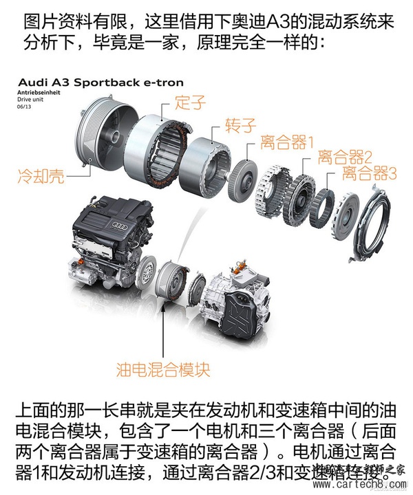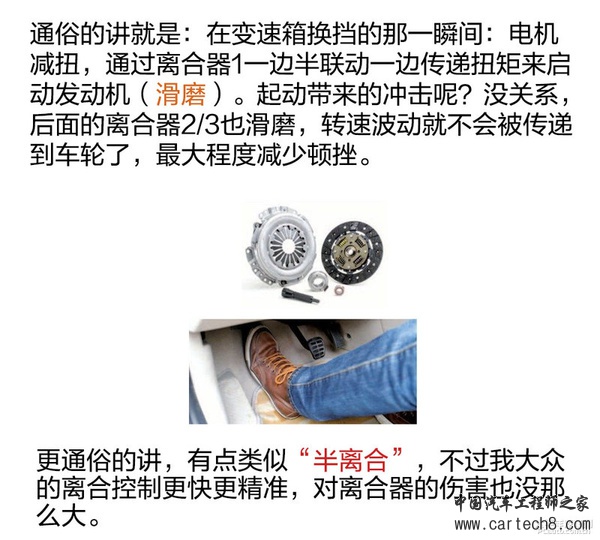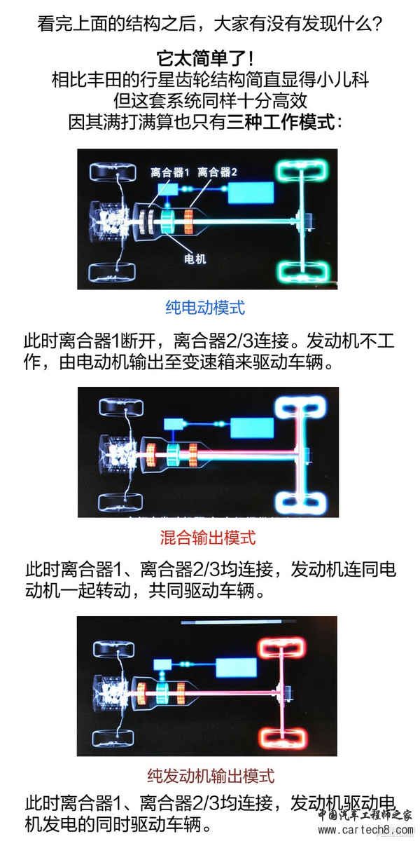 大家可能会比较疑惑,两个离合器加一个电机这么简单的结构就能实现油电混合动力?不急,我们接着往下看: