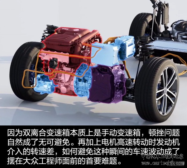 简单介绍完背景,我们回到高尔夫GTE的混动系统上面。这套混动系统为什么叫P2混动系统呢,因为这套系统有2个离合器,除了传统变速箱具备的离合器之外,在电动机和发动机中间还有一个离合器,具体如下: