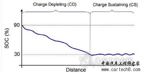 所以,从技术来讲,插电混合动力汽车是应该用电的,我们来看一下典型插电式混合动力汽车是如何工作的,如下图所示,Plug-inPruis等插电式混合动力汽车的控制分为两个阶段,电量消耗模式(CD)、电量维持模式(CS),从名称上也能够看得出来,在一定里程下,纯电动续驶里程可以覆盖的范围内,使用纯电动驱动。