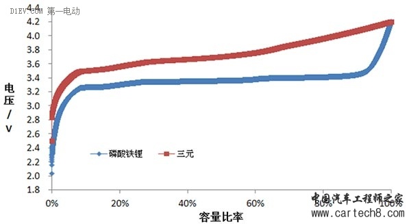 当然,电池材料体系的选择与消费者关系不大,厂家往往根据市场趋势和自身条件做出他正确的选择,下图是两种材料的电压-容量曲线。