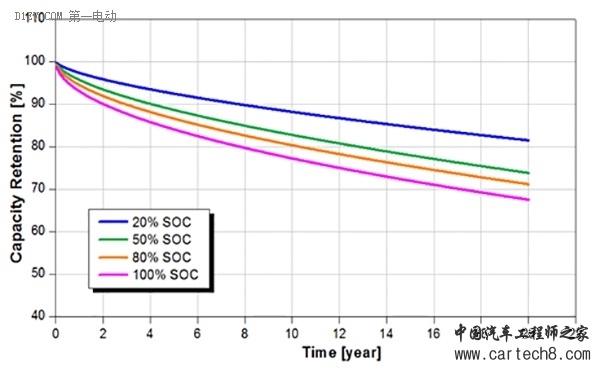 第二张图展示了电池或车辆正常存放时的衰减情况。图表的横轴为存放时间,单位:年;纵轴为电量保持率;图例分别为开始存放时,电池内所剩电量的SOC参数值。也说明了两个方面的信息,一是即使车辆不运行正常存放时,电池的电量也会逐渐衰减;二是正常存放时电池的电态越高,衰减的越快。存放时要注意的是,电池不能在完全放空电时存放,避免可能的过放电。