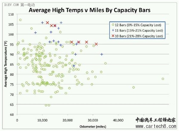 上面这张图是美国电动汽车协会调研特斯拉Roadster的衰减数据。图表名称可以译为:平均最高温度与行驶里程对电池容量影响的关系;横轴是行驶里程,单位:英里;纵轴是平均最高温度,单位:℉(单位:华氏度,为了大家理解方便,小编换算了一下,纵轴表示的温度范围为15.6℃-34.7℃,这里的温度应该是环境温度);图例中Capacity Lost的意思是电池容量的损失。显而易见,此图标呈现了两个趋势,一是行驶里程越长,衰减越大;二是温度越高,衰减越大。行驶里程和温度是两个很重要的影响因素。