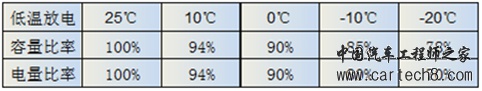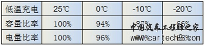 表中展示了低温下放电的电量变化情况,从常温25度到-20度,放出的电量降低30%。低温下充电也有类似现象。