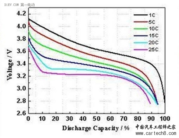 这个是三元材料的不同电流倍率的放电图,这个1C就是前面提到的1I1(A),5C就是5I1(A),倍率越大,相同容量比率下的电压越低,在横轴上也越短,也就是容量越低。图里面最低的倍率1C和最高倍率25C之间,横轴上的容量比率差了10%以上。急加速急减速,也就意味着电机要转更快,需要电池给它更多的电,结果有几个百分点的电就放不出来。