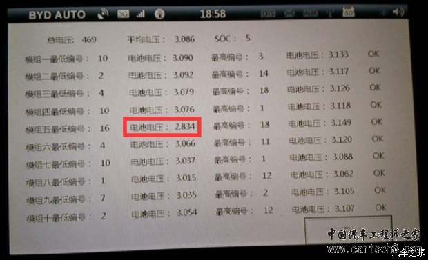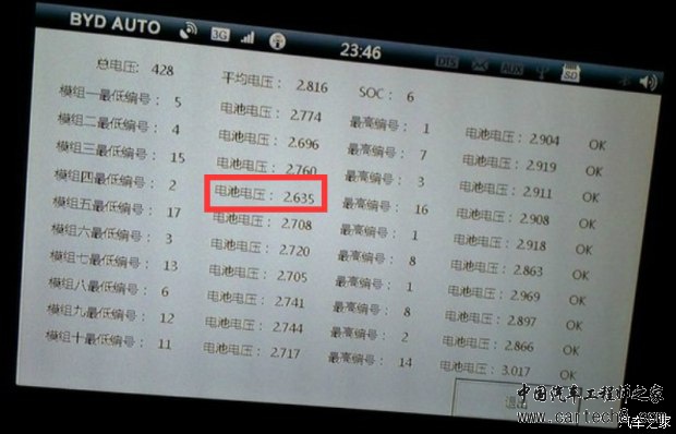 上图显示,所有的电池都已经低于2%容量,最低的是2.635V,剩下不到1%容量,秦居然显示动力电池剩余6%容量。