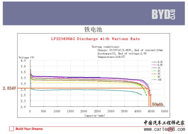 触发停止放电的是模组五的16号电池单体,2.834V。在BYD的官方电池放电曲线组中标出来,见下图,此时右端的剩余容量大约50mAh,占总容量4480mAh的1%,而此时秦显示动力电池还剩5%的容量。