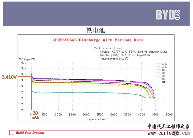 触发停止充电的是模组十的14号电池单体,3.410V。咱在BYD的官方电池放电曲线组中标出来,见下图,此时左端的剩余容量大约20mAh,占总容量4480mAh的0.4%,几乎可以忽略不计。