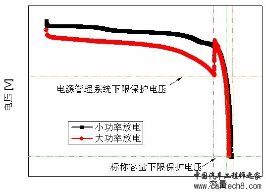 急加速时,电机需要电池在短时间内供给它更多的电,如上所述这种大功率放电的后果就是一部分的电放不出来。但是如果下次用比较平稳的方式开车,这部分电依然还在。下面这张图给出了大功率放电后,再接着用小功率放电的数据。通过数据,我们可以直观地看到驾驶电动汽车时,也需要尽量平和地操作。