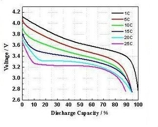 上图是三元材料的不同电流倍率的放电图, 1C到25C分别表示不同的电流倍率。由于电池具有一定的内部阻抗,电流倍率越大相同容量比率下的放电电压越低。