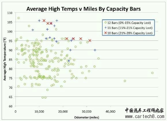 为此,美国电动汽车协会对特斯拉Roadster进行了调研。如下图的数据所示,电池的衰减呈现了两个趋势,一是行驶里程越长,衰减越大;二是温度越高,衰减越大。行驶里程和温度是两个很重要的影响因素。