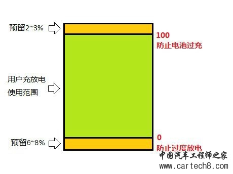 首先,我们来看一个概念“安全冗余”。这是从电池安全的角度考虑,电池的初始电量中,生产厂家会保留一部分电量不被使用。以大家熟悉的比亚迪“秦”为例,下图中系统显示电池电量为0时,其实系统还预留了6~8%的电量。同样,系统显示电池充电已经为100%时,其实也预留了2~3%的余量。