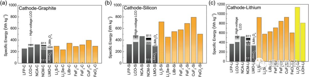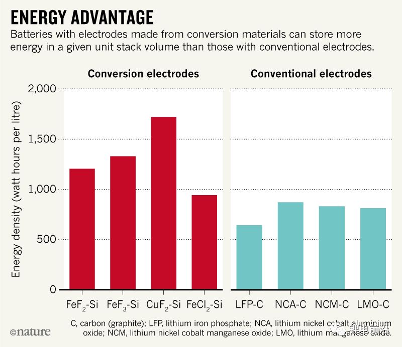图2.由替代材料电极的电池在单位堆叠体积中可比传统电池存储更多的能量。