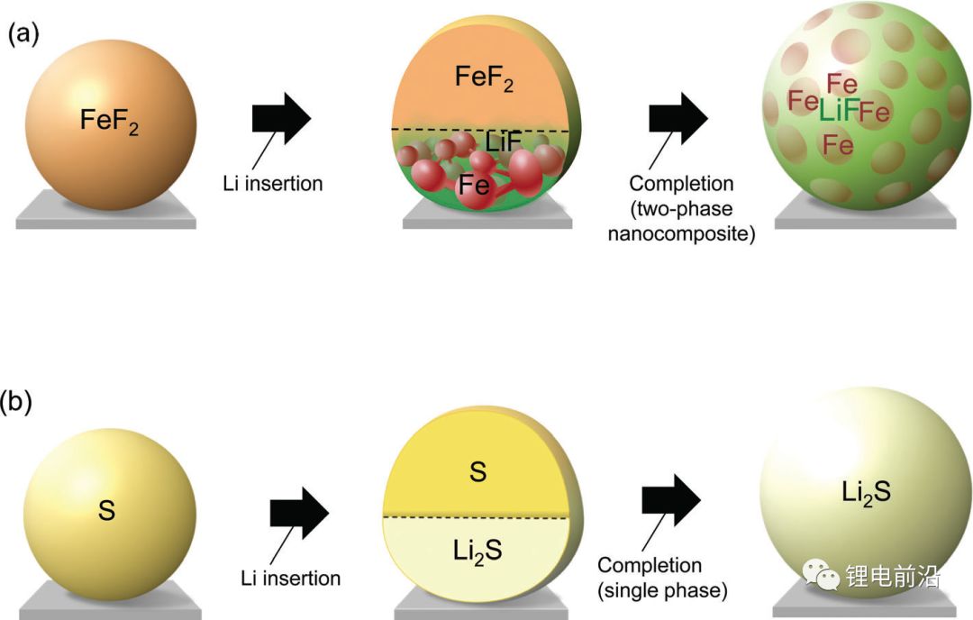 图3. Li进入材料S和FeF2的不同机理示意图。