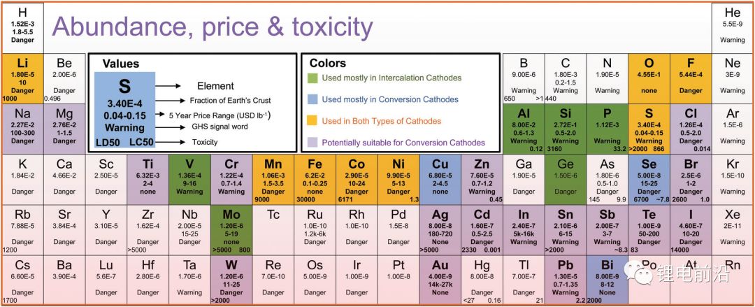 图4. 绿色标示元素用在嵌入型材料中;蓝色标示元素用在替换材料中;橘黄色标示材料可以在二者中都用。每一种元素内所包含信息是图内示例所示:第1行代表元素种类,第2行代表元素在地壳中的丰富程度,第3行代表该金属或者元素在过去五年平均价格,第4和第5行分别代表该元素对环境和人类的影响。