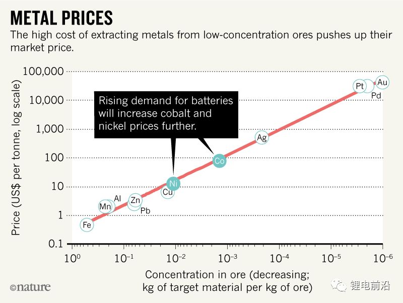 如果照此发展下去,钴和镍将在20年内出现供应缺口。随着LIBs的需求量持续增长,预计到2030年钴会供不应求,镍可能会在2037年以前断货。尽管我们可以开采质量较差的矿石,但更高的加工成本会推高钴镍价格。