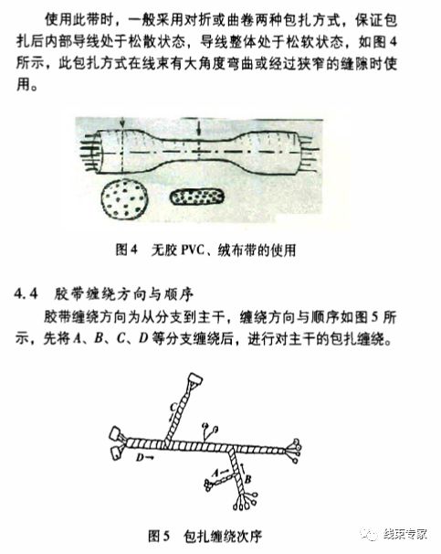 4.3.1胶带在导线束中的密缠绕密缠绕时一般采用1/2、1/4叠压缠绕,一次密缠绕后导线上的胶带分别为两层和一层,这样胶带才能对线束起到很好的密封和绝缘保护的作用,使线束内部的导线不易受到外界的损坏,如图l所示,此缠绕方式一般使用在发动机舱内的线束中。