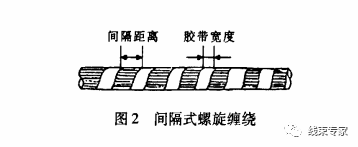 胶带在缠绕时,缠绕方式同密缠相同,同密缠的区别在于缠绕后导线被均匀裸露在外,一般情况下,间隔距离为实际用胶带宽度的0.5~2.0个胶带宽度,如图2所示,此缠绕方式一般使用在室内线束中。