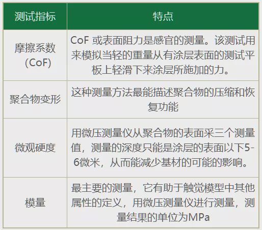 比如知名科思创公司就针对触觉量化方法提供了自己的见解,他们主要是通过摩擦系数 (CoF)、聚合物变形、微观硬度和模量四种数据来综合判定的。不过因为很多原因,这套模式还没有被广泛推行。