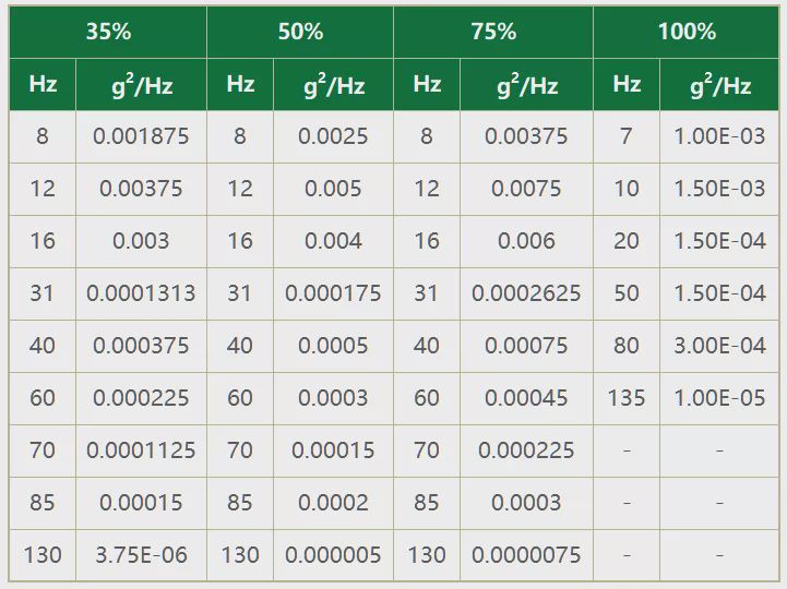 ▎按下表中路谱35%,50%,75%,100%进行噪音测试。