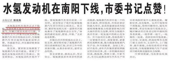 5月23日,《南阳日报》头版刊发的一则《水氢发动机在南阳下线,市委书记点赞!》报道,引发舆论广泛关注。