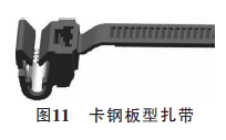 卡钢板型扎带主要用在钢板钣金的边缘用于卡住钣金, 使线束平滑过渡, 同时避免钣金边缘划破线束, 多用在位于驾驶室内的线束和后保险杠处, 钣金厚度一般为0.8~2.0mm。