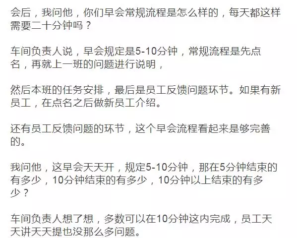 他们这个车间近三十号人,半小时到一小时在开早会,我有点难以置信,也难以理解。