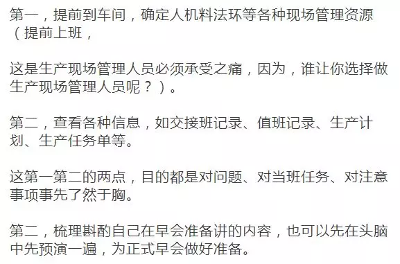 套路,或者说流程,车间要开好五分钟早会,利用好五分钟早会,除了要提前准备以外,我们还得要有既定的套路。