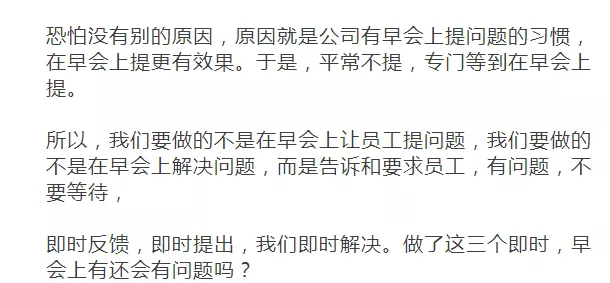 其次,更重要的是,我们要考虑或者自问,员工为什么会在早会上提问题?