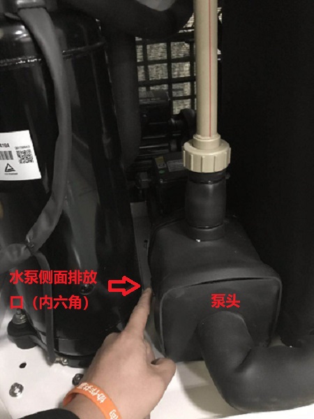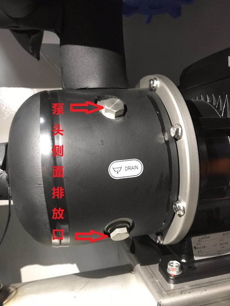 ⑴将冷水机泵头上的堵头拧开,把泵头的水排放干净,防止结冰后冻坏。