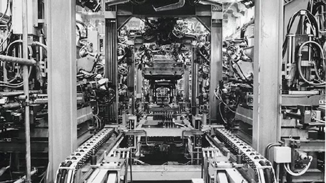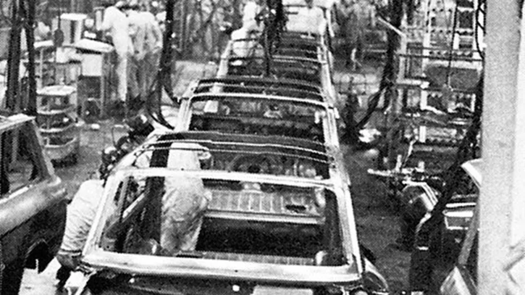 在1965年9月轻型货车L700的焊接生产线首次亮相,生产线操作员使用笨重的手工焊枪和辅助电缆来完成焊接工作。